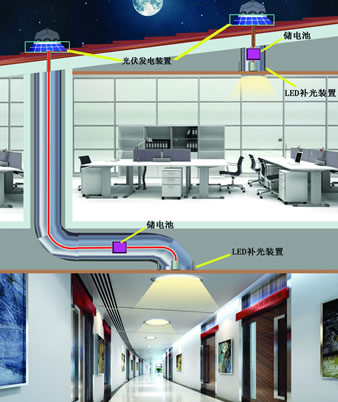 附加自主研发的自然采光-光伏-光电智能照明系统可以避免安装电力照明系统,晚上利用光伏发电装置白天所发的电带动无电照明系统里加装的LED补光模块进行照明,实现24小时无电照明。